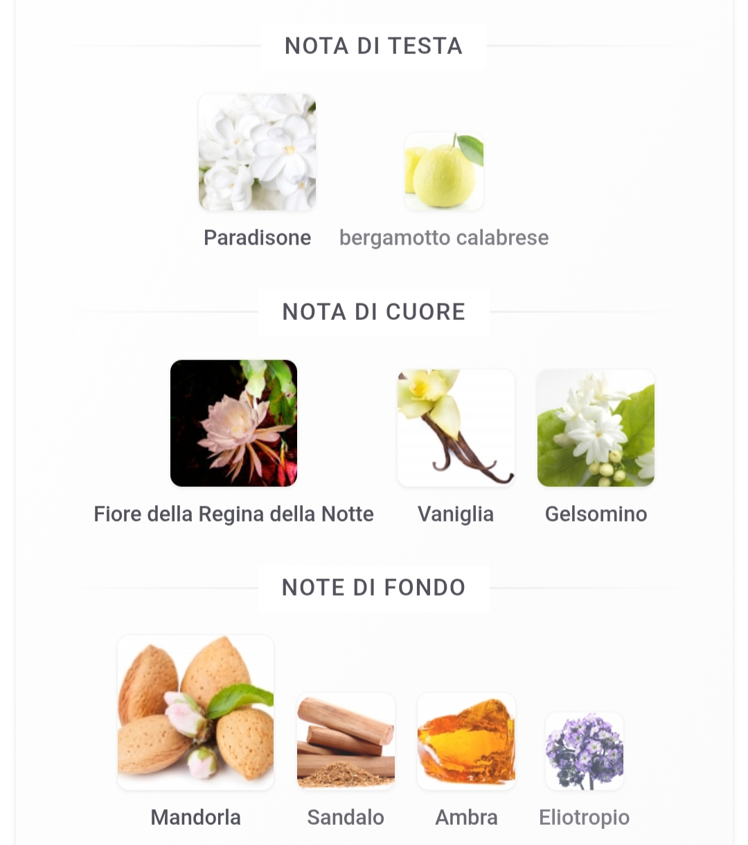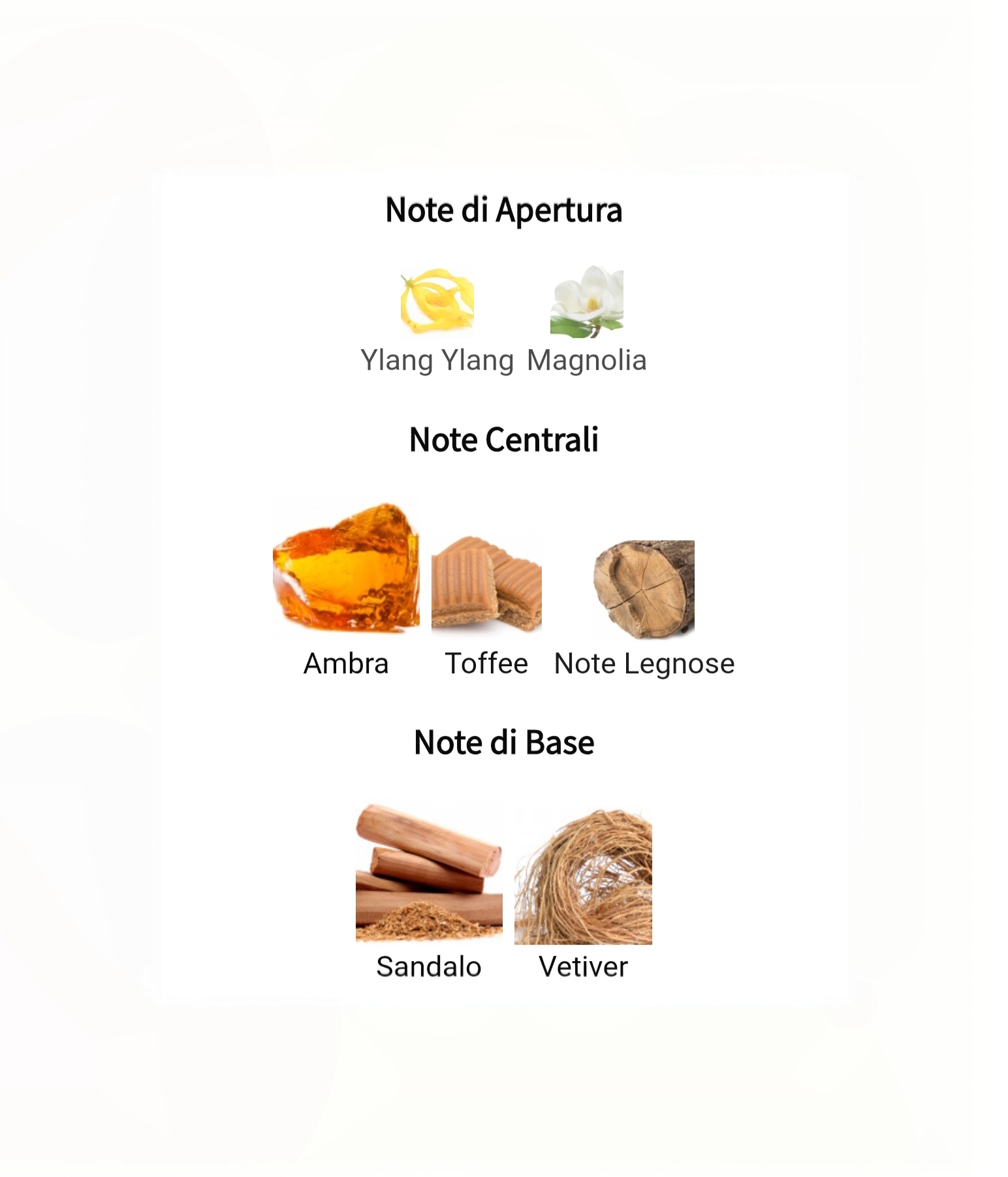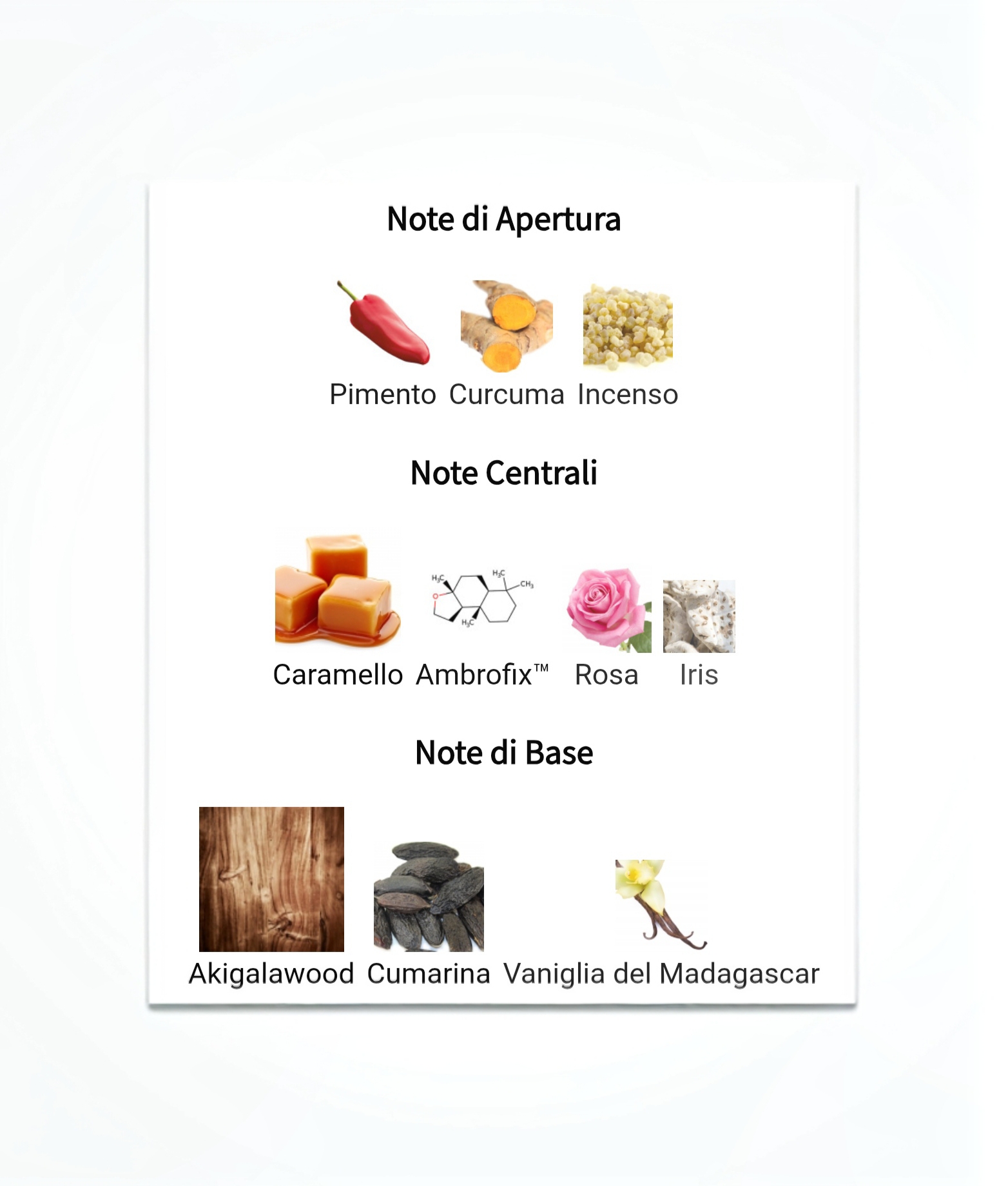 Infine, l'accordo Carismatico conquista con aromi accattivanti di cumarina e vaniglia di qualità eccezionale, seguite dal legno di Akigala che chiude la fragranza con una scia delicata e ipnotica.