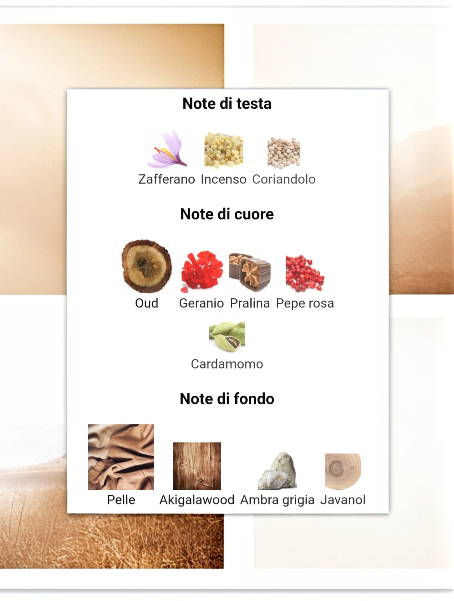 caramello e da una voluttuosa miscela di preziosi legni naturali.