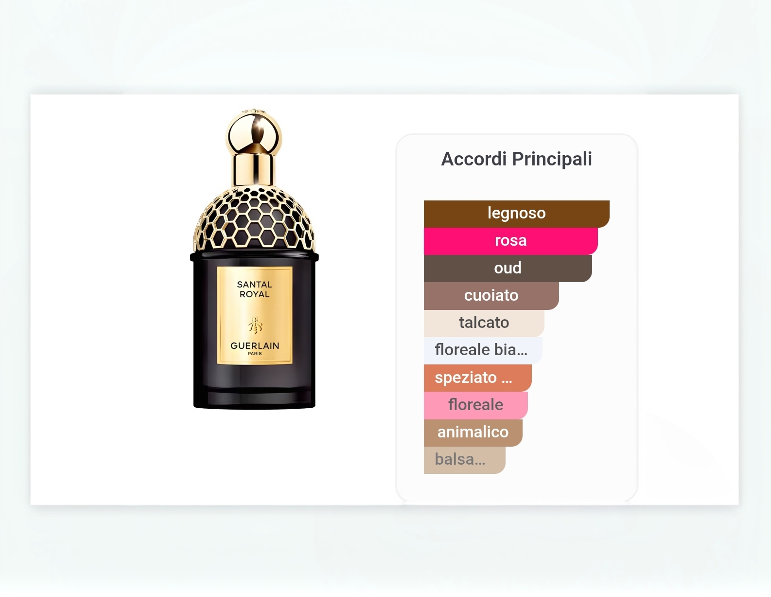 Santal Royal, un legno raro e prezioso si erge maestoso nella penombra. Un sillage che si rivela in un gioco di raffinati contrasti tra le note scure del Cuoio e del Legno di Oud e la luminosità delle note fiorite del Gelsomino e della Rosa. Un Sandalo seducente, pieno di mistero. Santal Royal, un legno raro e prezioso si erge maestoso nella penombra. Un sillage che si rivela in un gioco di raffinati contrasti tra le note scure del Cuoio e del Legno di Oud e la luminosità delle note fiorite del Gelsomino e della Rosa.