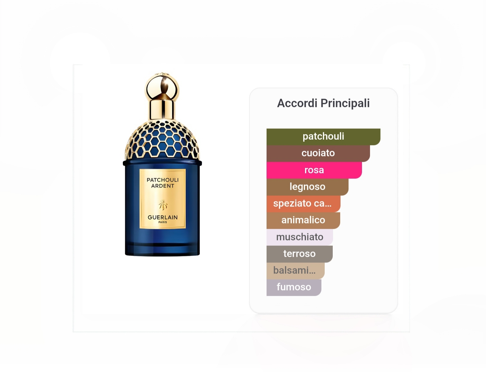 Patchouli Ardent è la reinterpretazione luminosa e accattivante del Patchouli. Il Patchouli, tipicamente legnoso, scuro e misterioso, svela le sue sfaccettature più vibranti al contatto con la Rosa e con il maestoso accordo di Cuoio e Muschi.