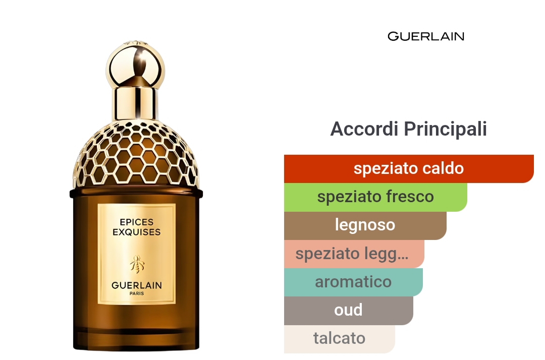 Épices Exquises evoca un viaggio sensoriale e avvolgente. Ispirandosi agli aromi speziati del Caffè al Cardamomo, Thierry Wasser, Maître-Parfumeur Guerlain, sublima i contrasti di spezie preziose in un chiaroscuro olfattivo che risveglia i sensi. Le sfaccettature fresche ed eleganti del Cardamomo entrano in contatto con un fondo caldo, intenso e sensuale, sublimato dal Pepe Nero e dalle note legnose di Oud, Patchouli e Sandalo.