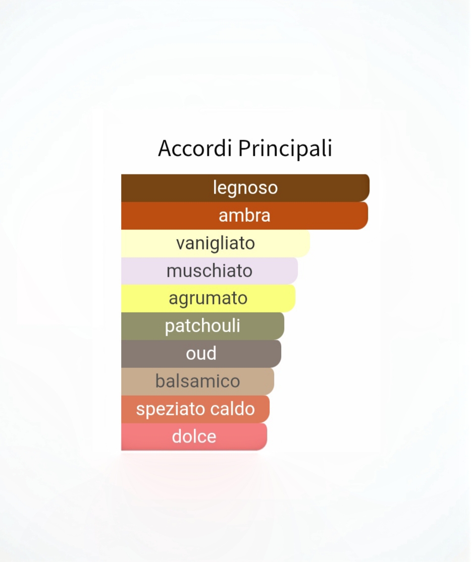 Legni biondi, ambra e patchouli si susseguono in una danza vorticosa. Il fondo legnoso, unito a note di muschio, è avvolgente, rassicurante e diabolicamente coinvolgente.