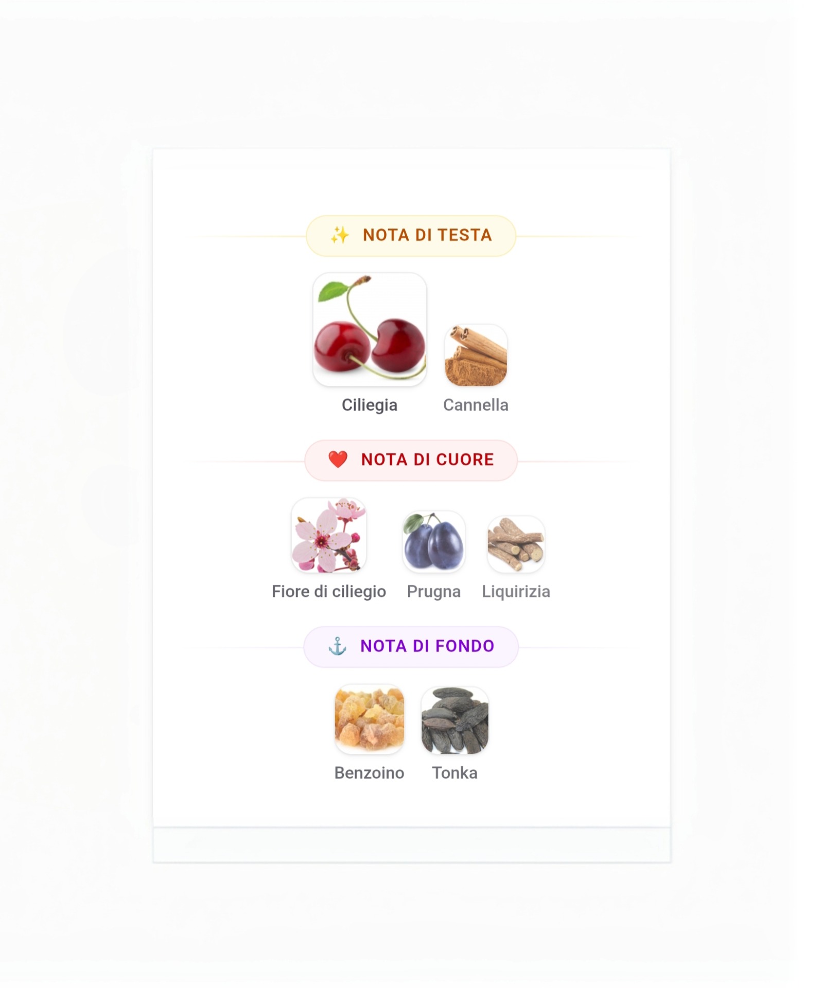 L'inconfondibile e avvolgente nota dolce della Ciliegia, armoniosamente unita alla Cannella, sfuma in uno scintillante connubio di Liquirizia e Prugna.
