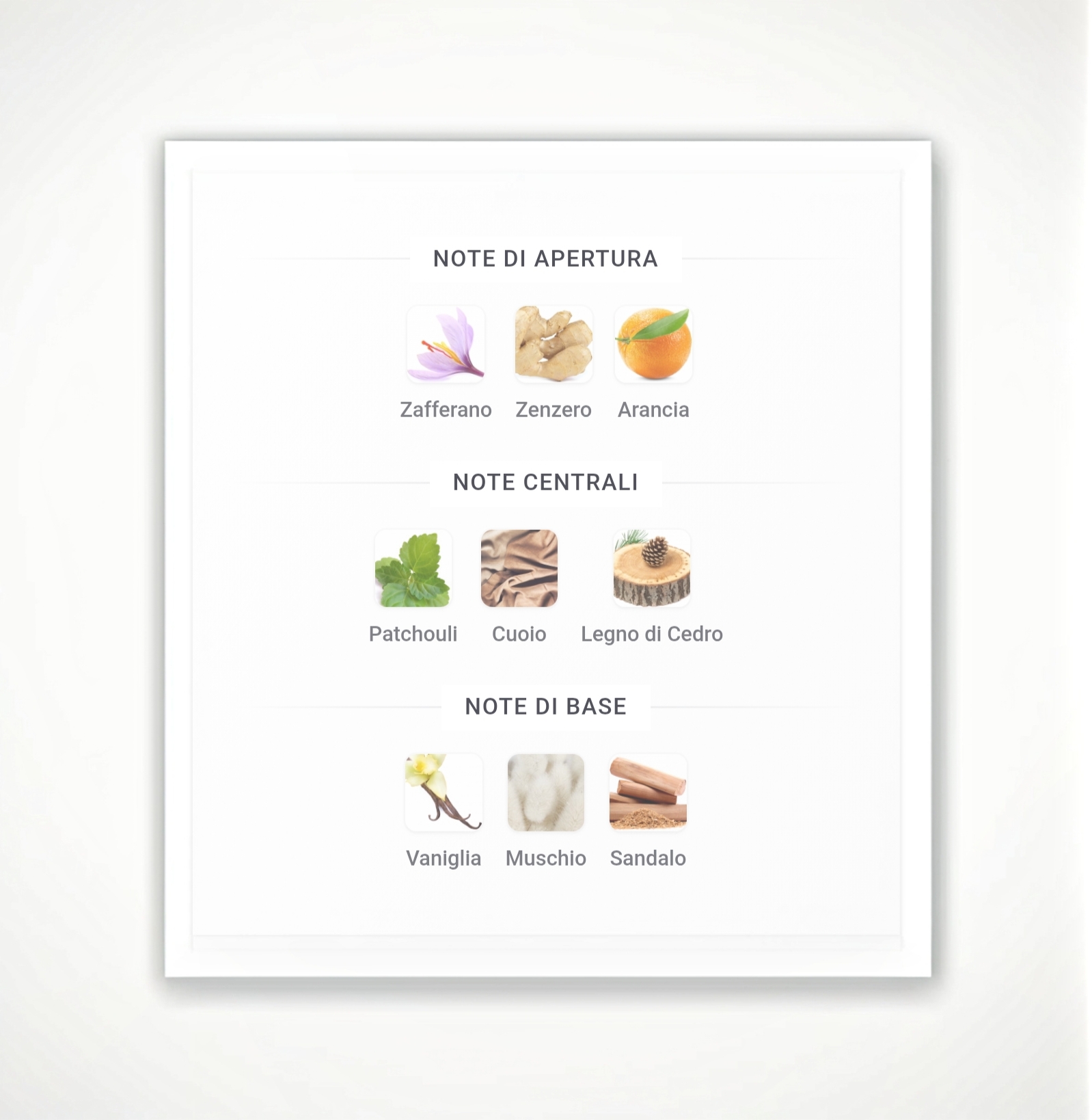Zafferano, zenzero e arancia aprono la fragranza con una calda e speziata succosità. Il cuore di patchouli, cuoio e legno di cedro la sostiene con una forza secca e terrosa. Una base di vaniglia, muschio e sandalo avvolge la fragranza in un calore morbido e duraturo.