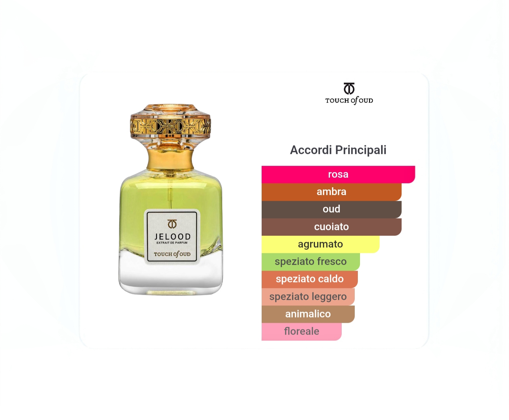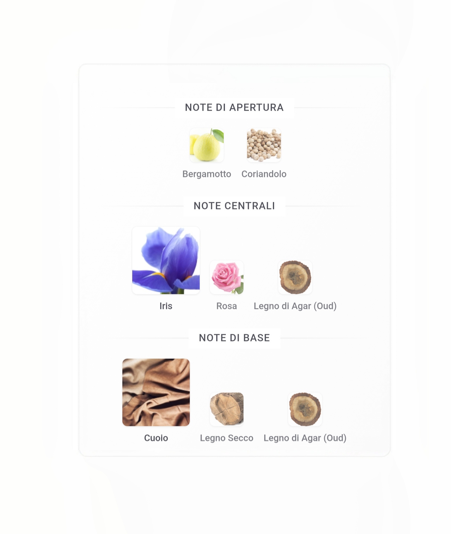 La fragranza si apre con un vivace bergamotto e un caldo coriandolo, per poi evolversi in un cuore di rosa, iris e prezioso legno di agar. Una base di cuoio, legno secco e oud conferisce alla fragranza una solenne forza e una presenza calma.