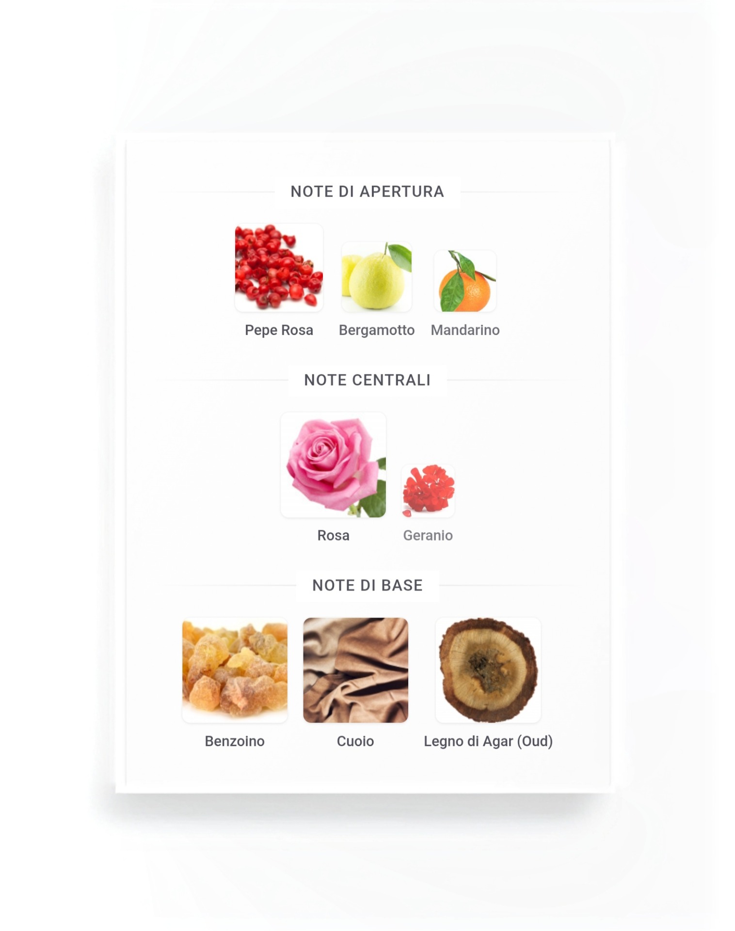 Si apre con la luce: bergamotto e mandarino, luminosi come il sole. Il pepe rosa guizza come una spezia nell'aria calda, sollevando il profumo e avvolgendoti. Il cuore rivela rosa e geranio, non floreali, ma sfaccettati. Un luccichio che fende la densità dell'oud, donando spazio, struttura e un senso di sollievo. E poi: il cuoio. Ricco, scuro e stratificato. Un mix di pelli, morbide ed elastiche, vissute e levigate. L'oud indiano si intreccia, non grezzo ma magistralmente modellato, conferendo alla composizione peso, ombra e anima. Il benzoino conferisce un bagliore resinoso.