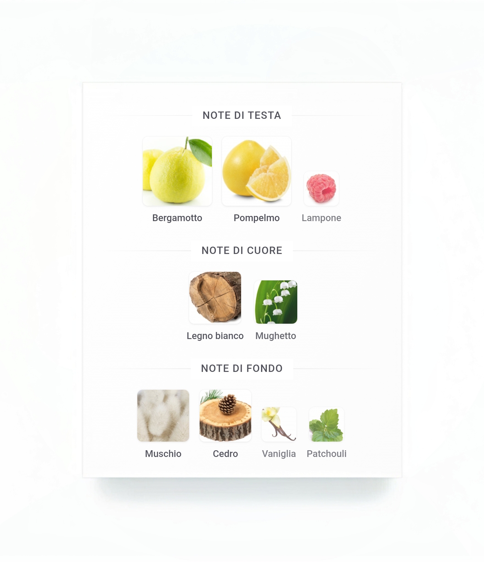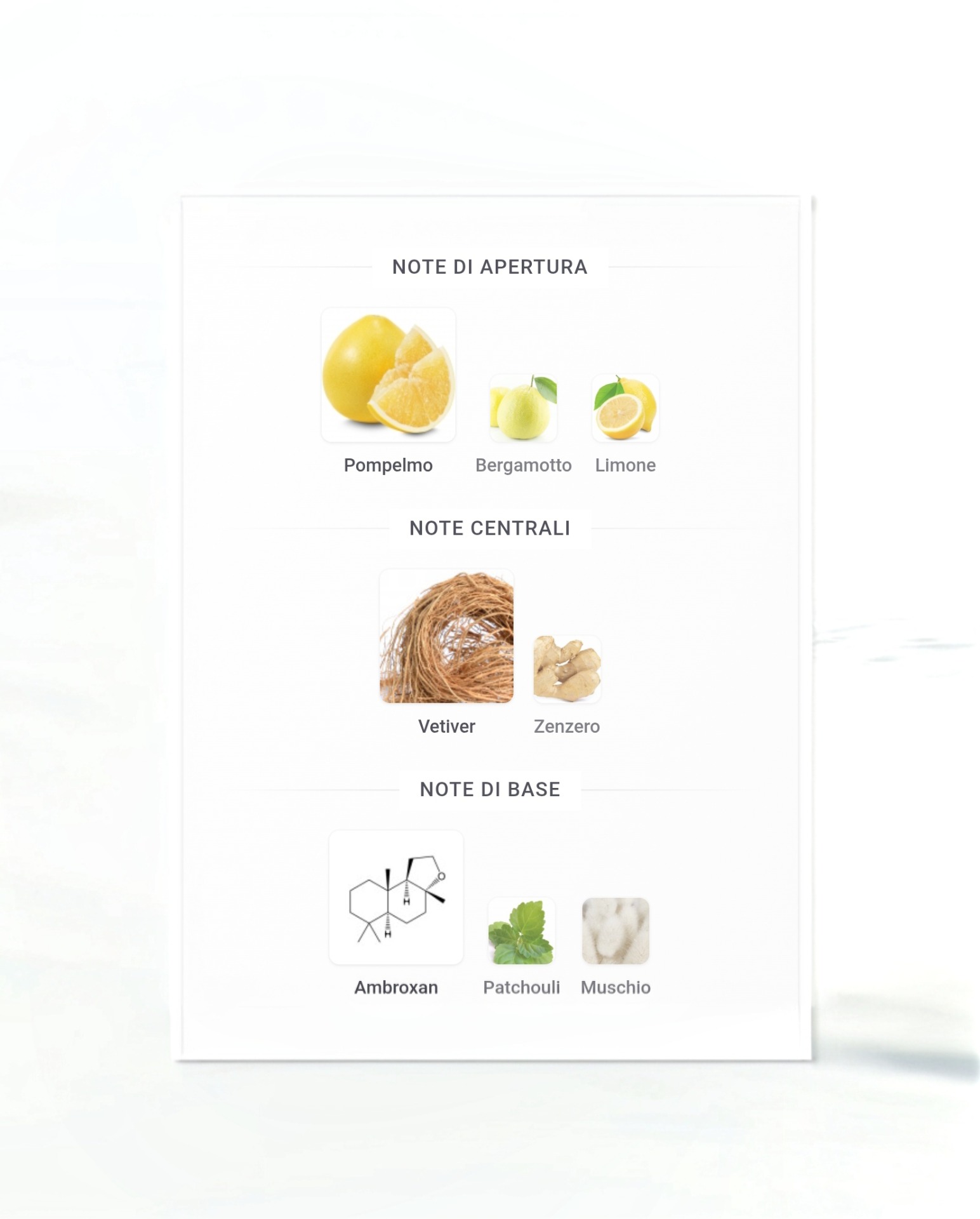 La fragranza si apre con un'esplosione di chiarezza: bergamotto, limone e pompelmo, freschi e luminosi. Queste note agrumate rimangono come un filo conduttore luminoso. Nel cuore, lo zenzero apporta freschezza, raffinatezza, una ventata di energia, sottile e costante. Segue il vetiver, verde e secco, che radica la composizione. È fresca, composta e sicura di sé. La base è potente nella sua quiete. Patchouli e ambroxan creano un fondo che vibra di presenza. Il muschio persiste come una seconda pelle.