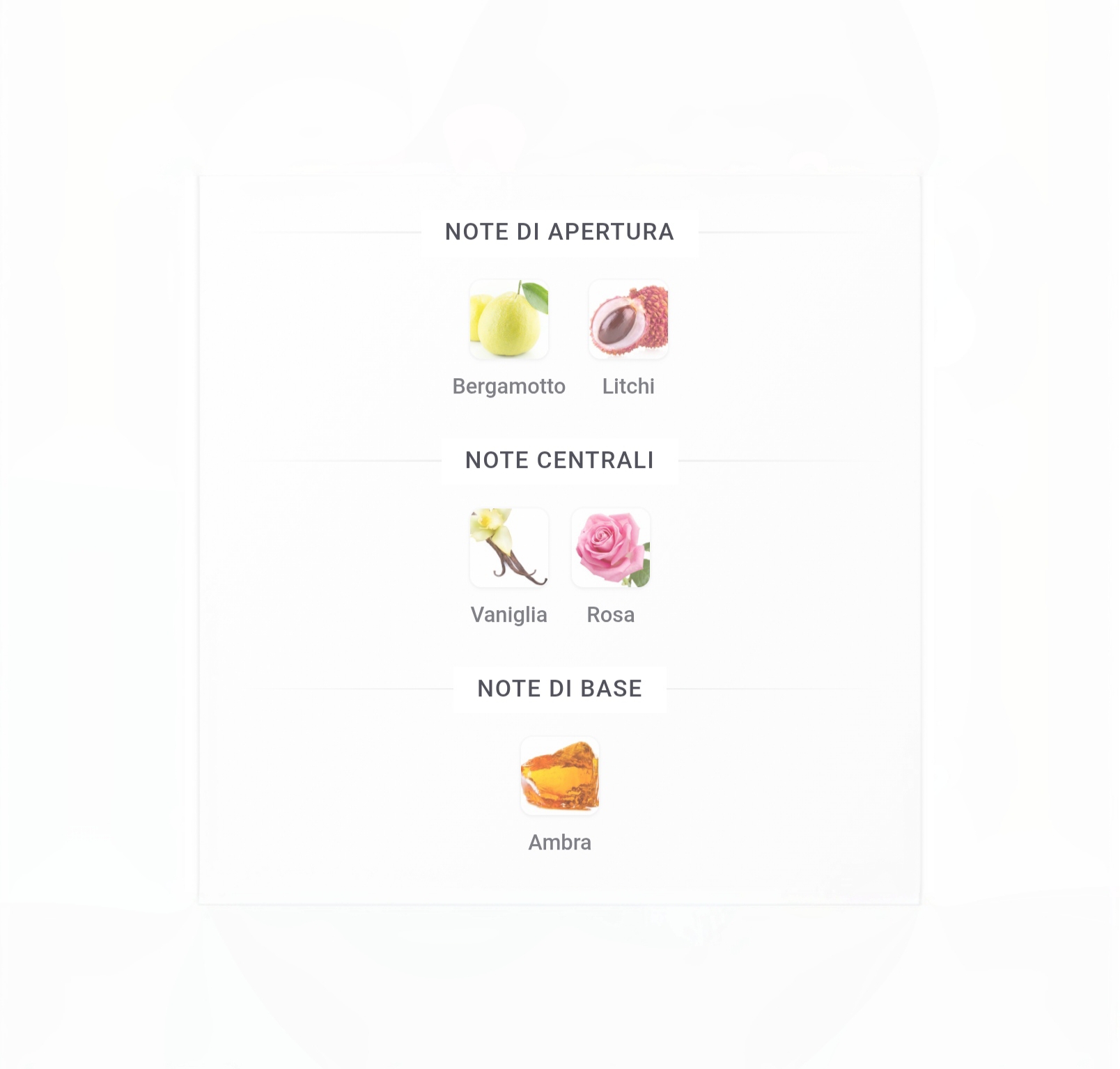 La fragranza si apre con litchi e bergamotto, freschi e succosi. Il litchi apporta una dolcezza rosata, delicata e vivace. Nel cuore, la rosa si dispiega, morbida ma definita, avvolta da una vaniglia dorata che sembra quasi illuminata dal sole, calda e confortante. C'è una ricchezza gourmand, mai pesante. La vaniglia risplende, non di zucchero, ma di morbidezza. Una base ambrata e discreta le conferisce profondità, un calore che indugia sulla pelle come la luce sull'acqua.